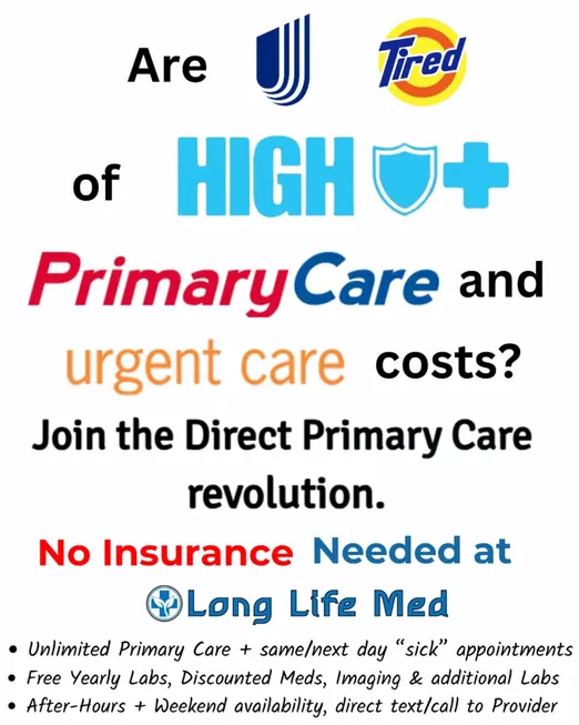 Text-based advertisement comparing high costs of primary and urgent care, promoting Direct Primary Care with no insurance needed at Long Life Med, and listing included benefits.