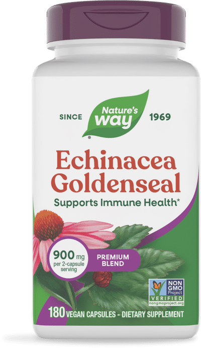 Both echinacea and goldenseal are botanicals native to North America. Echinacea is a flowering plant in the daisy family that has been used to support immune health for hundreds of years, while goldenseal is a plant that grows low to the ground. Both plants have been used by Native Americans for various wellness purposes. Nature’s Way Echinacea-Goldenseal combines the two with other herbs, including burdock root, gentian root, cayenne pepper, and wood betony, in a premium blend to help support your immune system.