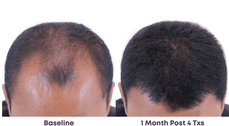 Most patients notice a significant reduction in shedding by the second treatment, thanks to the serum’s follicular “anchoring” effect, and sometimes as early as two weeks after the first treatment.