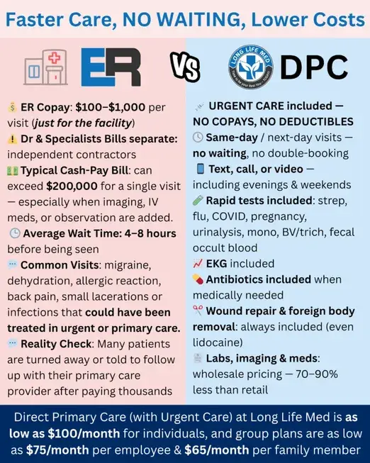Long Life Med also offers these same healthcare plans to small businesses for their employees and family members, starting at just $75 per month. By pairing a high-deductible or catastrophic insurance plan with DPC, businesses can save up to 30% on healthcare costs while offering their teams better access to care and prevention.